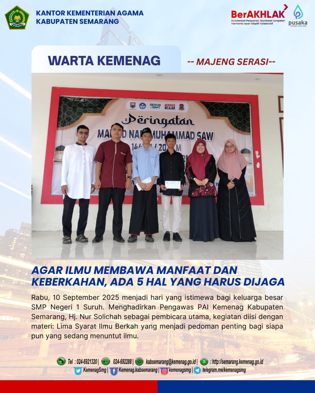Rabu, 10 September 2025 menjadi hari yang istimewa bagi keluarga besar SMP Negeri 1 Suruh. Menghadirkan Pengawas PAI Kemenag Kabupaten Semarang, Hj. Nur Solichah sebagai pembicara utama, kegiatan Maulid Nabi Muhammad SAW 1447 H /2025 M diisi dengan materi: Lima Syarat Ilmu Berkah yang menjadi pedoman penting bagi siapa pun yang sedang menuntut ilmu.