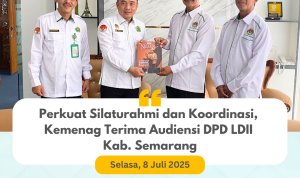 Kepala Kantor Kementerian Agama Kabupaten Semarang, H. Ta’yinul Biri Bagus Nugroho, menerima audiensi dari jajaran Dewan Pimpinan Daerah Lembaga Dakwah Islam Indonesia (DPD LDII) Kabupaten Semarang, Selasa (8/7/2025). Pertemuan berlangsung hangat di ruang kepala kantor Kemenag Kab. Semarang.