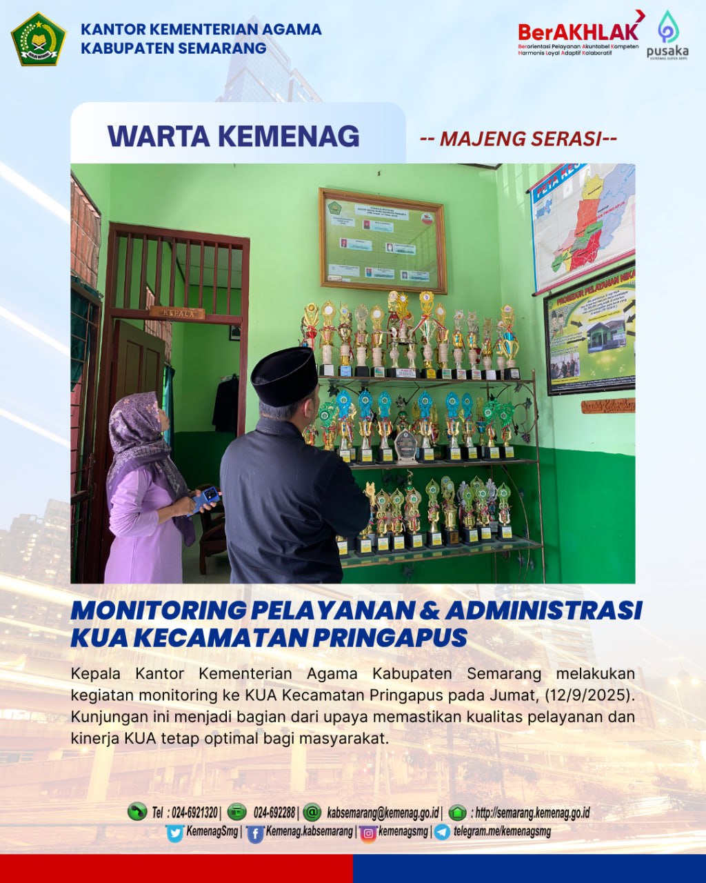 Kepala Kantor Kementerian Agama Kabupaten Semarang, H. Ta’yinul Biri Bagus Nugroho melakukan kegiatan monitoring ke KUA Kecamatan Pringapus pada Jumat, (12/9/2025). Kunjungan ini menjadi bagian dari upaya memastikan kualitas pelayanan dan kinerja KUA tetap optimal bagi masyarakat.
