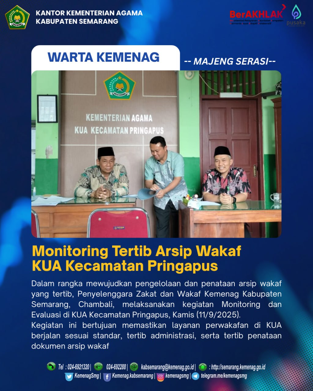 Dalam rangka mewujudkan pengelolaan dan penataan arsip wakaf yang tertib, Penyelenggara Zakat dan Wakaf Kemenag Kabupaten Semarang, Chambali, melaksanakan kegiatan Monitoring dan Evaluasi di KUA Kecamatan Pringapus, Kamis (11/9/2025).