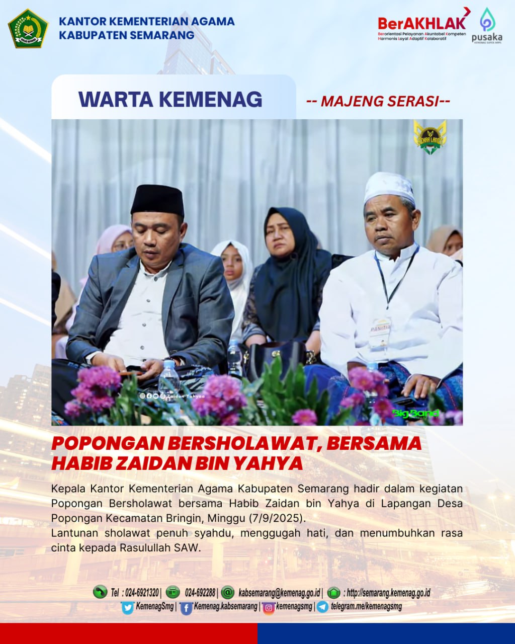 Lapangan Balai Desa Popongan, Kecamatan Bringin dipenuhi lautan jamaah yang bersama-sama melantunkan sholawat, mengharap ridha Allah SWT, serta meneladani akhlak mulia Nabi Muhammad SAW.
