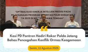 Kepala Seksi Pendidikan Diniyah dan Pondok Pesantren (Kasi PD Pontren) Kementerian Agama Kabupaten Semarang, Hj. Titik Halimah, menghadiri Rapat Koordinasi Internal Kewilayahan Kasat Intelkam Jajaran Polda Jateng yang digelar di Hotel Noormans Semarang, Senin (11/8/2025).