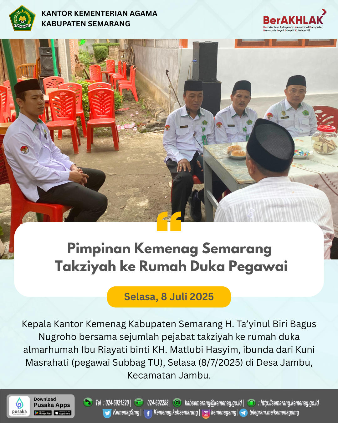 Kepala Kantor Kementerian Agama Kabupaten Semarang, H. Ta’yinul Biri Bagus Nugroho, melakukan takziyah ke rumah duka almarhumah Ibu Riayati binti KH. Matlubi Hasyim, ibunda dari Kuni Masrahati, salah satu pegawai Subbag Tata Usaha Kankemenag Kab. Semarang, Selasa (8/7/2025).